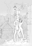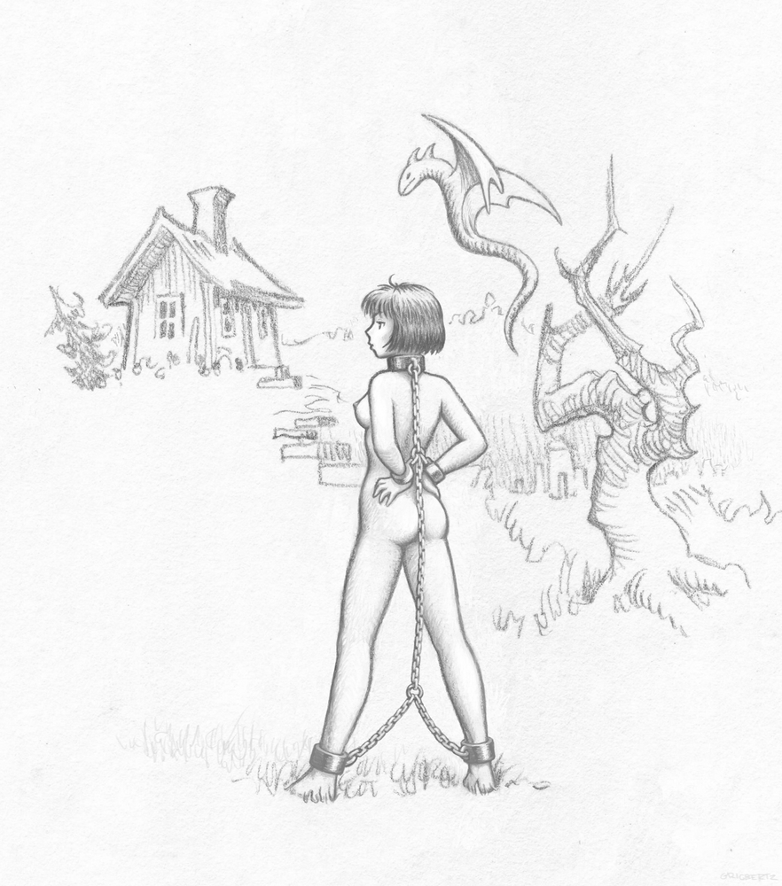 She found herself in a strange outdoor landscape with an oddly unreal quality. Assuming it was still part of the dungeon—perhaps a pocket dimension—Scarlett spotted buildings in the distance and noticed creatures watching her. Naked and chained, she had no choice but to press forward.