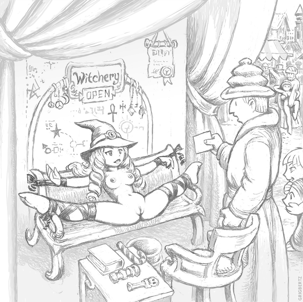 Erbeth has to manage her witchery business while naked and tied up, as decreed by her Pixie Ceding, who is safely hidden inside the witch hat at this point.