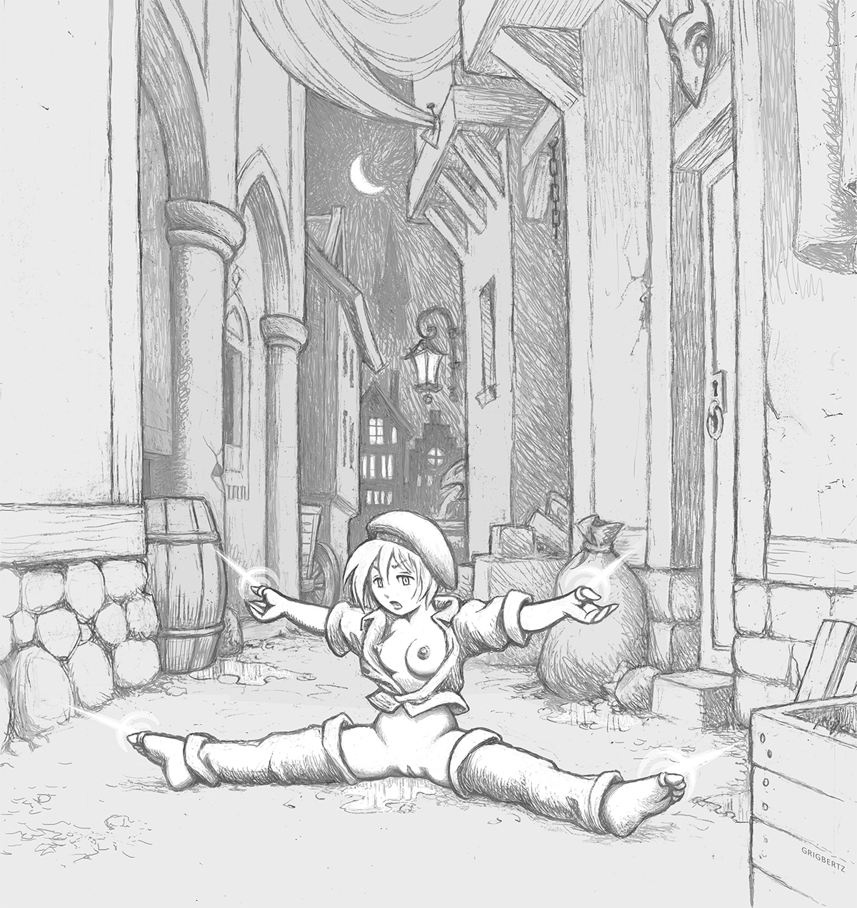 With her new unremovable magic armor set, she has had no choice but to continue her adventuring career naked, as it doesn't allow her to wear anything else. It does provide her with enough magic enhancement to make her one of the strongest adventurers in town, able to take on the toughest missions solo.