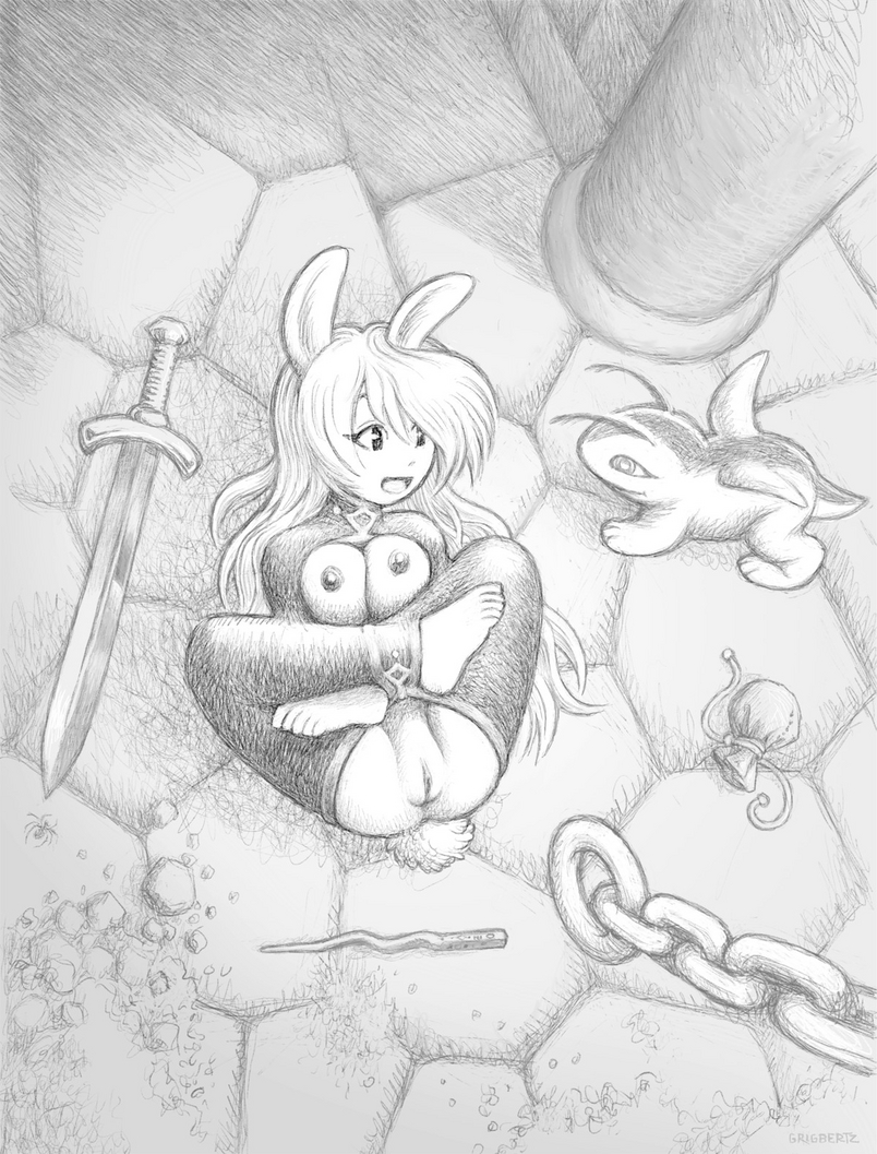 The bunny girl had been captured in an ill-fated dungeon expedition. The Dungeon Mistress had her put in magic restraints and kicked out to find her way back home on her own.