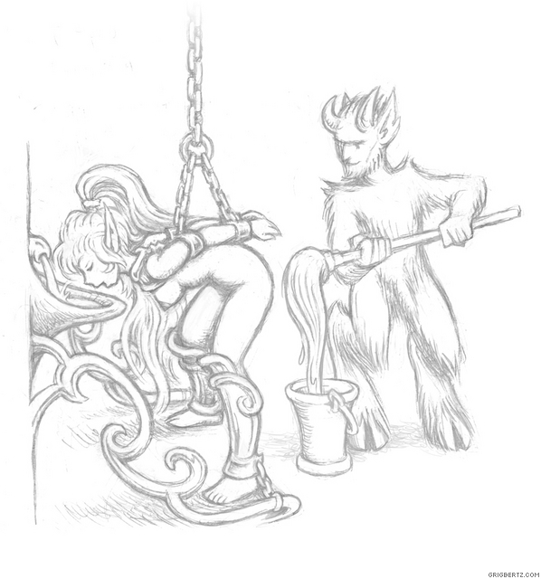 The maids Beryl and Indigo enjoy a good night's sleep after another busy day. With Beryl trapped in a bondage puzzle box Indigo can for once snuggle safely on her friend's bosom without fear of being crushed by her habitual tossing and turning.
