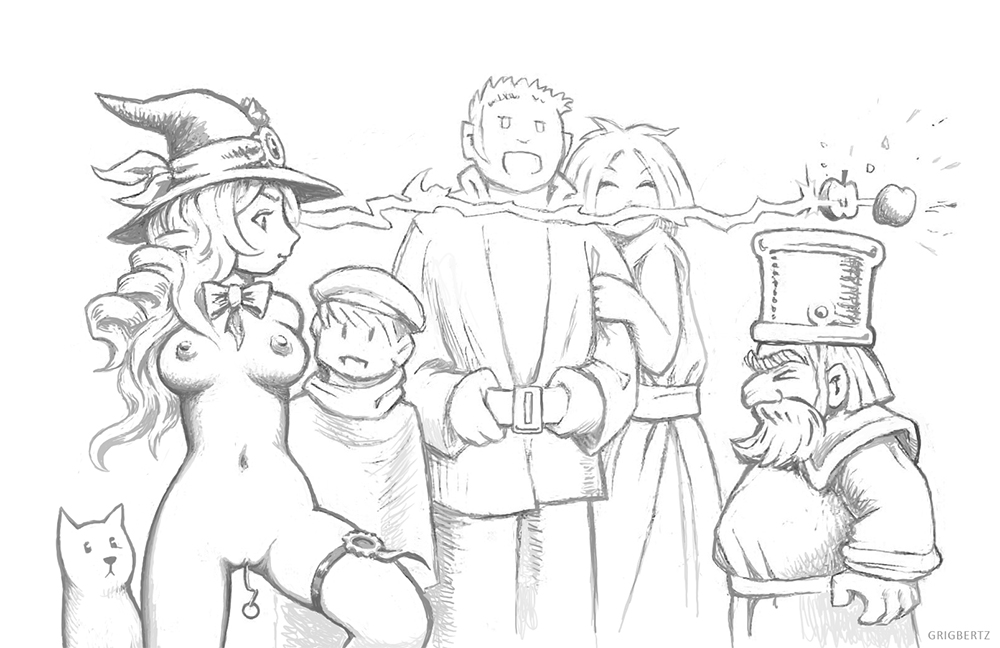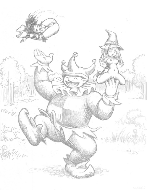 Erbeth has to manage her witchery business while naked and tied up, as decreed by her Pixie Ceding, who is safely hidden inside the witch hat at this point.