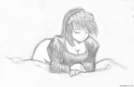 The maids Beryl and Indigo enjoy a good night's sleep after another busy day. With Beryl trapped in a bondage puzzle box Indigo can for once snuggle safely on her friend's bosom without fear of being crushed by her habitual tossing and turning.